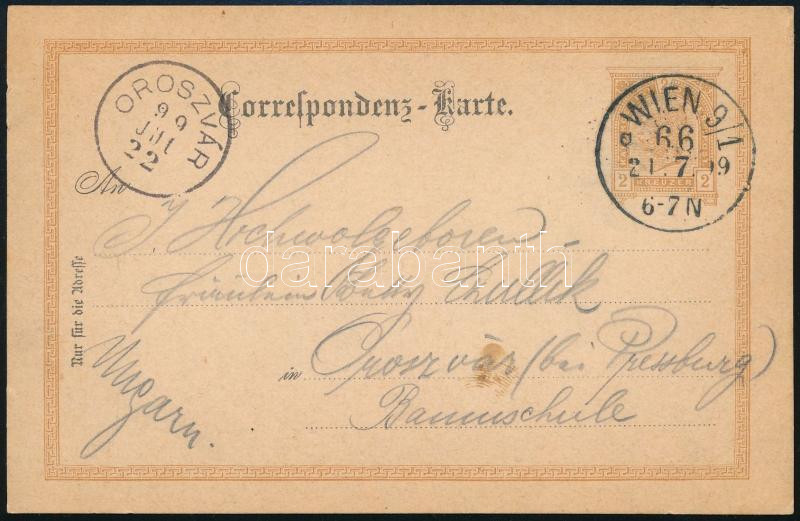 Description: 1899 Bécs (Wien), "Gruss aus dem Liechtensteinpark", kézzel rajzolt képeslap, Czullik Bettinek, Czullik Ágost, a Liechtenstein hercegi kertek igazgatója lányának küldve Oroszvárra (Pozsony)