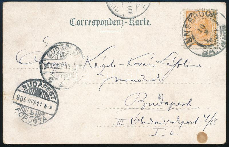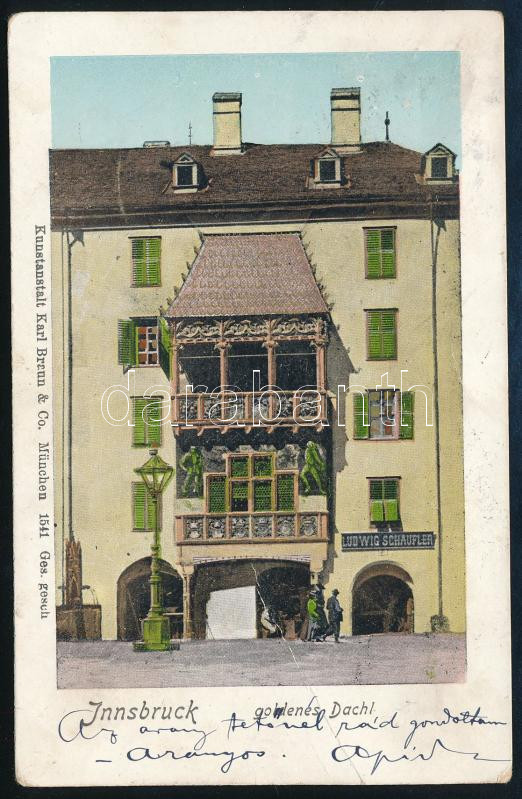 1900 Kézdi-Kovács László (1864-1942) festőművész, műkritikus autográf humoros verses sorai az innsbrucki goldenes Dachl ábrázoló, feleségének küldött képeslapon, töréssel.