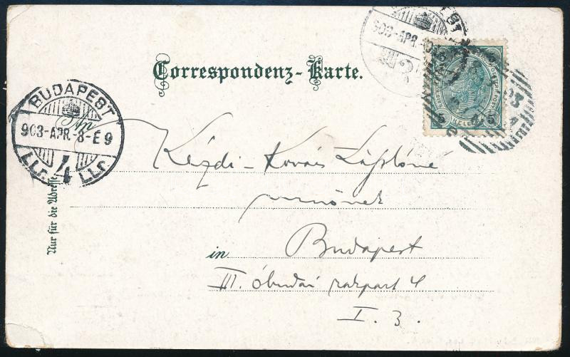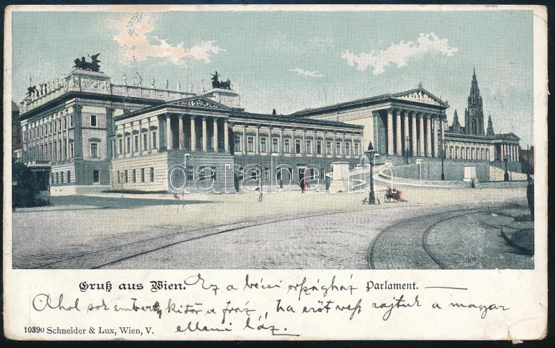 Description: 1903 Kézdi-Kovács László (1864-1942) festőművész, műkritikus autográf humoros verses sorai a bécsi parlamentet ábrázoló, feleségének küldött képeslapon: "Az a bécsi országház, ahol sok emberen kitör a frász, ha erőt vesz rajtuk a magyar elleni láz".