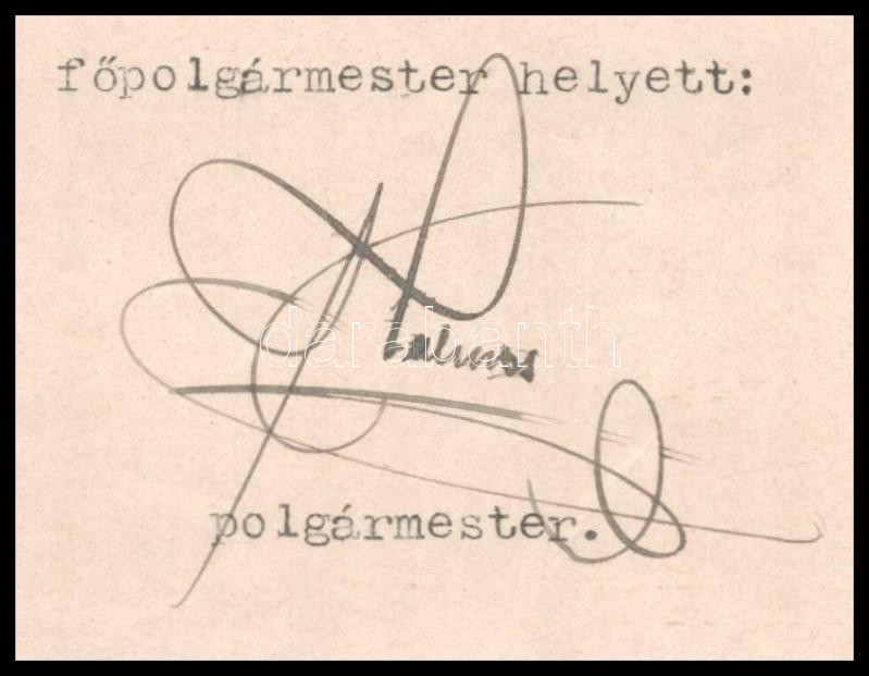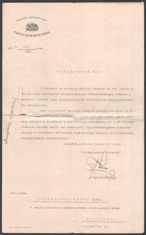 Description: 1903 Kronberger Lipót (1846-1924) zsidó származású bankár, a Magyar Általános Takarékpénztár Rt. vezérigazgatójának szóló gépelt levél, Halmos János (1847-1907) Budapest polgármesterétől (1897-1906), a Kronbergernek adományozott Ferencz József-rend lovagkeresztjét érintő hivatali ügyekben. Halmos János autográf aláírásával, "Budapest Székesfőváros Főpolgármestere" fejléces papíron, szakadt.
