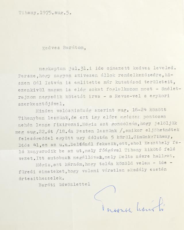 1975 Tihany, Passuth László (1900-1979) író gépelt levele ismeretlen személy részére, autográf aláírásával, 1975. aug. 5.