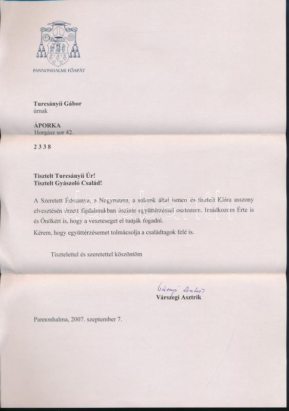 2007 Várszegi Asztrik (1946- ) bencés szerzetes, püspök, pannonhalmi főapát (1991-2018) autográf aláírása részvétnyilvánító levelén, fejléces levélpapíron