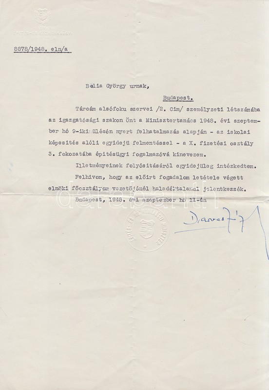 Darvas József (1912-1973) Ãró, politikus, épÃtÅ‘- és közmunkaügyi miniszter egy oldal terjedelmű, gépelt levele Belia György (1923-1982) középiskolai tanár végzettségű, egykori orosházi ismerÅ‘sének, épÃtésügyi fogalmazóvá kinevezésének tárgyában, a Minisztérium vakbélyegzéses, fejléces, Kossuth-cÃmeres levélpapÃrján, a levél alján Darvas József saját kezű aláÃrásával. Kelt: Budapest, 1948. szeptember 11. Egyetlen levél, mérete: 293x206 mm, tizenhárom beÃrt sor. Az orosházi születésű Darvas József népi Ãró, politikus még orosházi éveiben ismerte meg a fiatal erdélyi, középiskoláját ott végzett Belia Györgyöt. Onnan hÃvta meg minisztériumi fogalmazóvá a német, francia, orosz, román nyelvet beszélÅ‘ Beliát. A levél szövegébÅ‘l: ,,Tárcám alsófokú szervei személyzeti létszámába [...] - az iskolai képesÃtés alóli egyidejű felmentéssel - a X. fizetési osztály 3. fokozatába épÃtésügyi fogalmaóvá kinevezem. Illetményei folyósÃtásáról egyidejűleg intézkedtem. FelhÃvom, hogy az elÅ‘Ãrt fogadalom letétele végett elnöki fÅ‘osztályom vezetÅ‘jénél haladéktalanul jelentkezzék." Jó állapotú levél, hajtogatva.