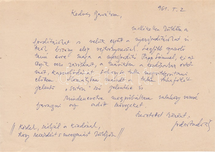 Fodor András (1929-1997) költő, műfordító saját kézzel írt, egy oldal terjedelmű válaszlevele Belia György (1923-1982) szerkesztőnek egy, a Magvető Kiadó által kiadni szándékozott afrikai líraválogatás (Ébredő Afrika, 1961) ügyében, néhány, a nyersfordítások minőségét illető megjegyzéssel. Kelt: [Budapest], 1961. január 2. Egyetlen levél, mérete: 148x210 mm, 15 beírt sor. 1960-ban, az afrikai gyarmatok felszabadulása idején a Magvető Kiadó - a folyamat ünneplése gyanánt - elhatározta egy eredeti afrikai líraválogatás kiadását. Az ,,Ébredő Afrika" címet viselő válogatás szerkesztője Belia György (1923-1982) szerkesztő, a Szépirodalmi és az Európa kiadó lektora volt. Belia György számos költőnagyságot kért fel versfordításra, a Fodor András igent mondott a felkérésre. A levél szövege: ,,Kedves barátom, mellékelten küldöm a fordításokat s velük együtt a nyersfordításokat is. Azok bizony elég rejtvényszerűek. Legfőbb igazoló tanú erre maga a nyerfordító Papp Sámuel, ki az egyik vers zárósorait, a másikban a kezdőszakasz értelmét, kapcsolódásait sehogy se tudta megvilágosítani előtte. Homályban maradt a talán ruhafélét jelentő ,,sutru" szó jelentése is. Mindenesetre megpróbáltam valahogy verssé faragni az adott szövegeket. Szeretettel köszönt: Fodor András. (Kérlek, szóljál a kiadónál, hogy szerződést s miegymást küldjön.)" A műfordító két fordításával jelent meg a kötetben. Jó állapotú levél, hajtogatva.