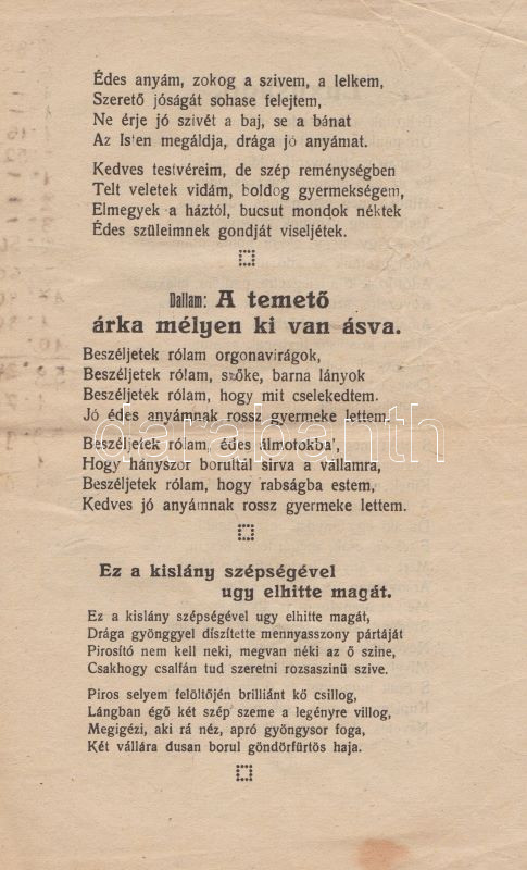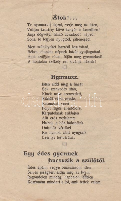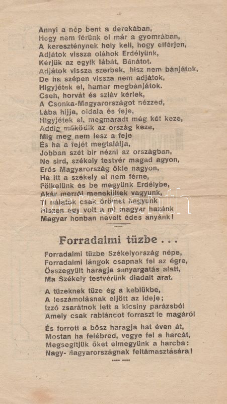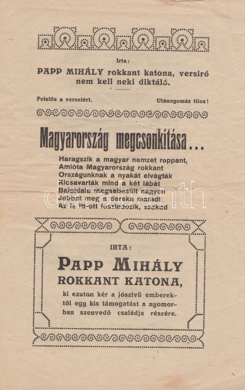 Papp Mihály Papp Mihály rokkant katona önsegélyező, hazafias dalgyűjteménye. (Győr, 1926 körül). Szerző (,,Széchenyi" ny., Győr). [8] p. Egyetlen kiadás. Kiadványunk Papp Mihály rokkant katona 12, többségében a trianoni döntést fájlaló költeményét adja közre, a szerző saját családja segélyezésére szánta a kiadványból származó bevételt. Két oldalon apró pótlások, kézi verskiegészítések, két oldalon számítások, két levélen kisebb szakadás. Fűzve, borító nélkül. Rendkívül ritka, a könyvészet által nem ismert alkalmi kiadvány.
