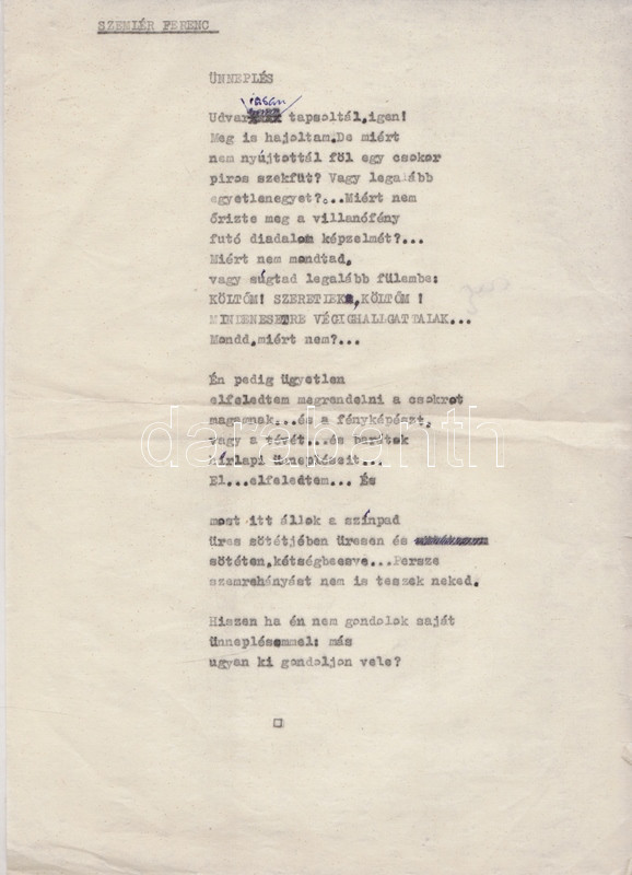 Szemlér Ferenc (1906-1978) erdélyi Ãró, költÅ‘ ,,Ünneplés" cÃmű versének egy oldal terjedelmű, gépelt, eredeti kézirata, a költÅ‘ saját kezű javÃtásaival, a szöveg végén a költÅ‘ által gyakran használt berekesztÅ‘ négyzet jellel. A vers szövege nyomtatásban a költÅ‘ ,,Kései kaszálás" cÃmű kötetének 70. oldalán jelent meg (Kriterion Könyvkiadó, Bukarest, 1973). A javÃtott szövegű kézirat és nyomtatott változata megegyezik. Jó állapotú lapok, hajtásnyommal.