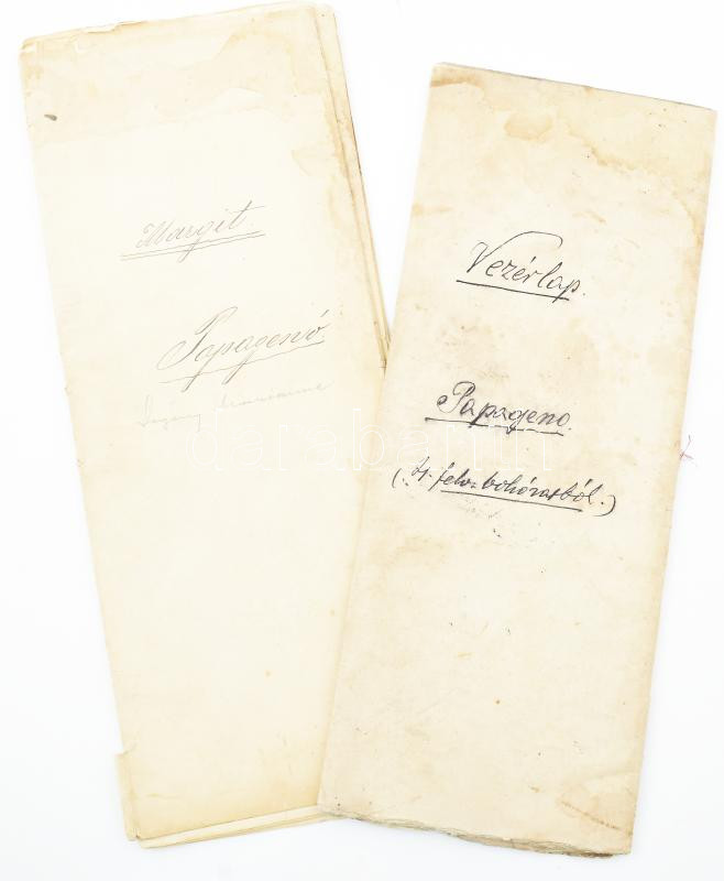cca 1896 Jegyzetek a Papagenóból, az egyik: "Vezérlap Papageno", Romváry Várady Lajos (1852-1916) súgó, színigazgató jegyzetei, 9 sztl. lev.; "Papagenóból - Margit", színházi jegyzetek, 7+3 p. Hajtottak, kis szakadásokkal, foltokkal.