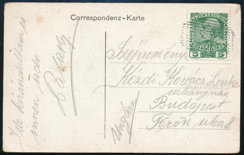 Description: cca 1905-10 Pataky László (1857-1912) festőművész autográf üdvözlő sorai és aláírása Kézdi-Kovács László (1864-1942) festőművész, műkritikus lánya, Lenke részére Maria Straßenengelből küldött képeslapon.
