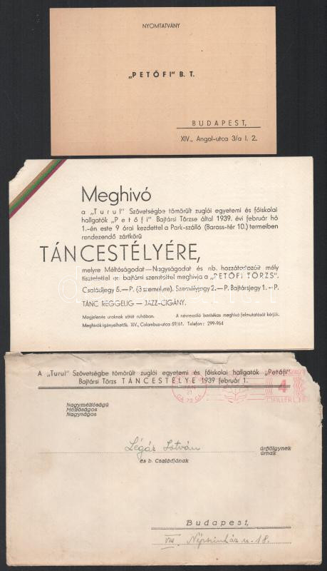 Description: 1939 Meghívó a "Turul Szövetség" zuglói egyetemi és főiskolai "Petőfi" Bajtársi Törzse által rendezett Táncestélyre, Bp., Park Szálló, 1939. feb. 1. Eredeti borítékkal, a boríték és a meghívó sarkán hiánnyal.