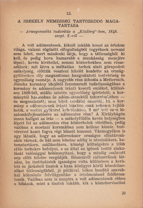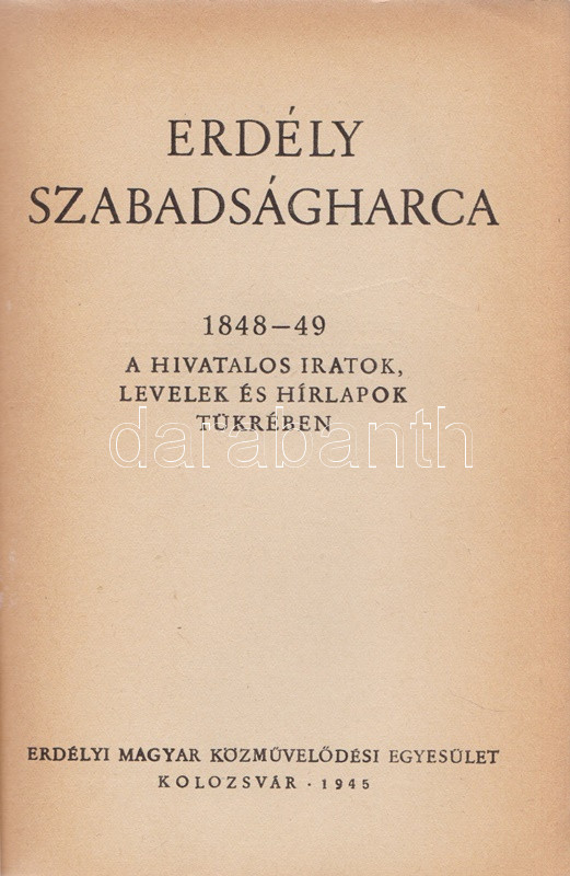 Erdély szabadságharca. 1848-49 a hivatalos iratok, levelek és hírlapok tükrében. (Bevezető: Bözödi György, előszó: Balogh Edgár). Kolozsvár, 1945. Erdélyi Magyar Közművelődési Egyesület (Minerva ny.) 1 t. (címképen Kossuth portréja) + 95 + [1] p. + 3 t. (kétoldalas). A második világháború végén ismét Romániához került Erdélyben elsőként megjelent történeti munka Erdély 1848-1849-es történetéről, egykori levelek és hivatalos iratok alapján. A munka magyar és székely, szász, román szerzőségű, többségében a forradalomhoz és nem a Habsburg-házhoz leveleket, iratokat egyaránt közread, és nem tagadja a románok által végrehajtott magyarellenes vérengzéseket: ezeket elítéli, egyszersmind tudtul adja, hogy az 1848-as jobbágyfelszabadítás nem az ausztriai Ház, hanem a magyar országgyűlés rendelkezése volt - ez utóbbi tehát egyáltalán nem volt közismert az erdélyi románság körében. Fűzve, enyhén gyűrött, kiadói borítóban. Jó példány.