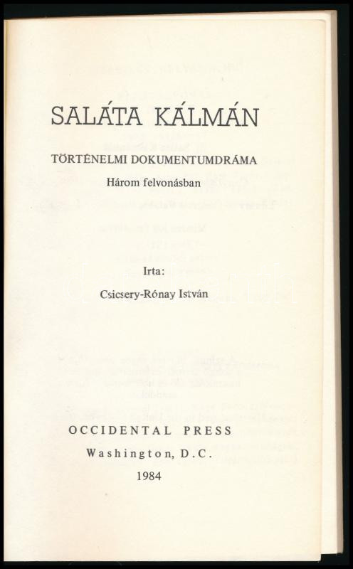 Csicsery-Rónay István: Saláta Kálmán. Történelmi dokumentumdráma három felvonásban. Washington, 1984, Occidental Press. Kiadói papírkötés, jó állapotban.