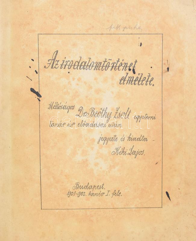 Dr. Beöthy Zsolt: Az irodalomtörténet elmélete. Méltóságos - - egyetemi tanár úr előadásai után jegyezte és kiadta Kéki Lajos. Bp., 1901-1902, ny.n., 403+(1) p. Stencilezéssel sokszorosított egyetemi jegyzet. Korabeli félvászon-kötésben, kissé sérült borítóval, helyenként kissé sérült lapszélekkel, foltos lapokkal, az utolsó lap sérült, javított.