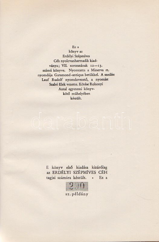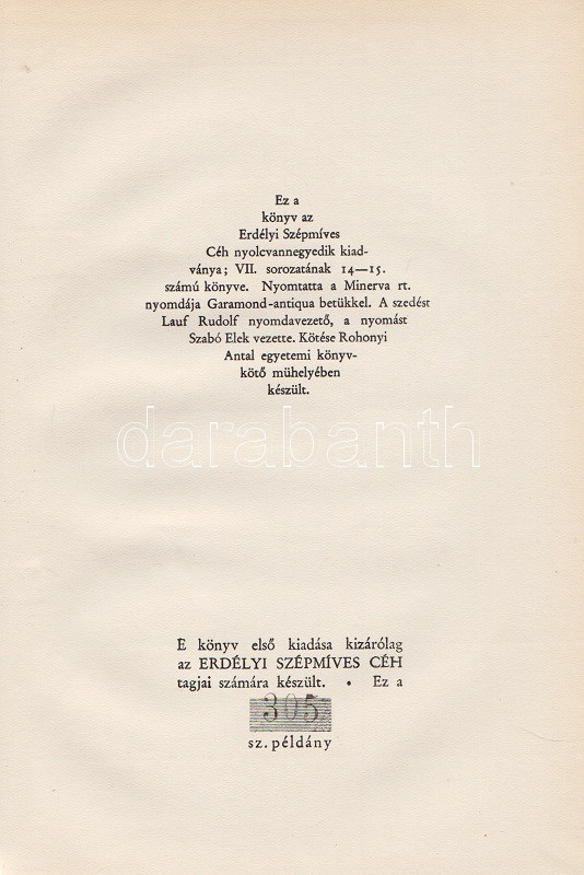 Kolofon: ,,Ez a könyv az Erdélyi Szépmíves Céh nyolcvanharmadik és nyolcvannegyedik kiadványa, VII. sorozatának 12-13. és 14-15. könyve. E könyv első kiadása kizárólag az Erdélyi Szépmíves Céh tagjai számára készült. Ez a 290. és 305. példány."