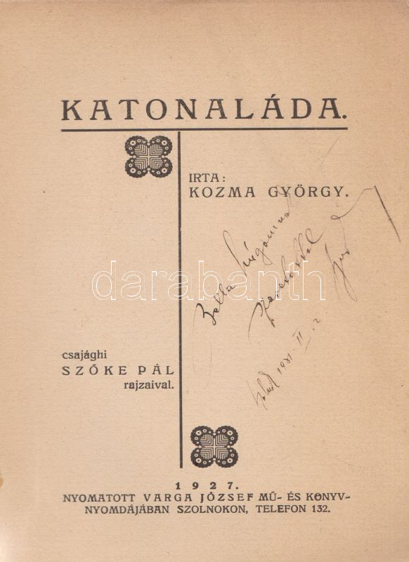 Kozma György: Katonaláda. Csajághi Szőke Pál rajzaival. (Dedikált.) Szolnok, 1927. Varga József mű- és könvynyomdája. 96 p. Egyetlen kiadás. Dedikált: ,,Bella húgomnak szeretettel: Gyuri. Szolnok, 1931. II. 2". Katonatörténetek és katona-anekdoták az 1913. évi klagenfurti kiképzéstől az első világháború, kaszárnyabeli életéből. A vérbő, harsány humorral megírt történetek feltűnően kerülik a harctéri eseményeket. Oldalszámozáson belül Szőke Pál szövegközti karikatúráival. Fűzve, Szőke Pál színes rajzával illusztrált, sérült, enyhén hiányos gerincű kiadói borítóban, a fedőborítókon apró, halvány foltosság.
