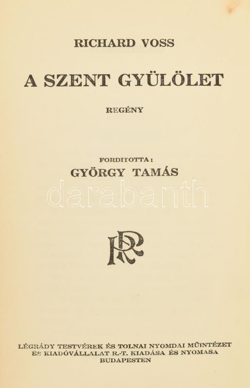 Richard Voss: A szent gyülölet. Ford.: György Tamás. Ragyogó Regénytár... https://www.darabanth.com/en/465-Online-auction/465.0/Books/Books-Other-rarities~2500026/Richard-Voss-A-szent-gyulolet-Ford-Gyorgy-Tamas-Ragyogo-Regenytar-Bp-1929-Legrady-256-p~II3134342