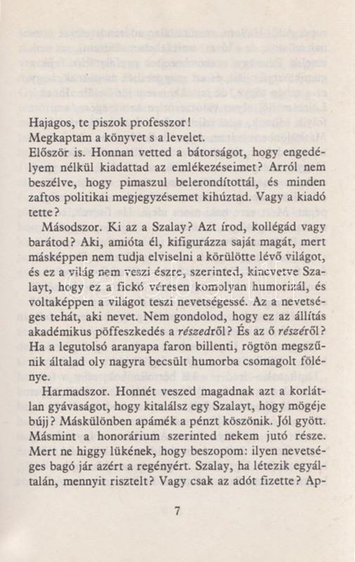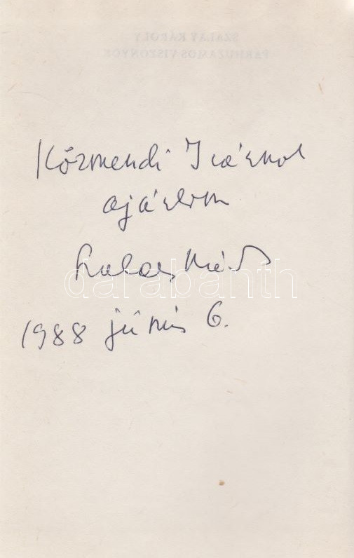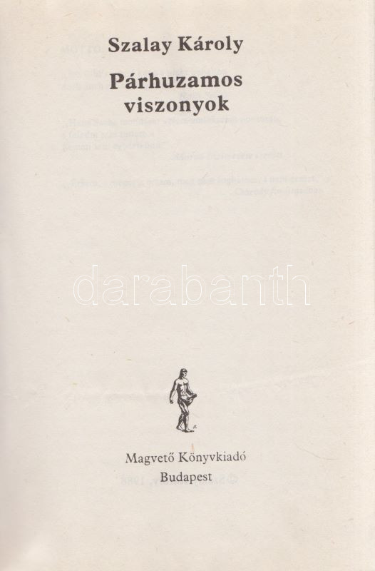 Szalay Károly: Párhuzamos viszonyok. (Regény.) (Dedikált.) Budapest, (1988). MagvetÅ‘ Könyvkiadó (Sylvester János Nyomda, Szombathely). 558 + [6] p. ElsÅ‘ kiadás. Dedikált: ,,Körmendi Ivánnak ajánlom: Szalay Károly. 1988. június 6." A szerzÅ‘ 1956-os trilógiájának önmagában is megálló, középsÅ‘ darabja. A forradalomnak emléket állÃtó, nem mellesleg erotikus részletekben bÅ‘velkedÅ‘ regény az 1988-as könyvhét egyik nagy sikere volt. Kiadói egészvászon kötésben, eredeti, illusztrált védÅ‘borÃtóban. Jó példány.