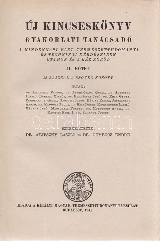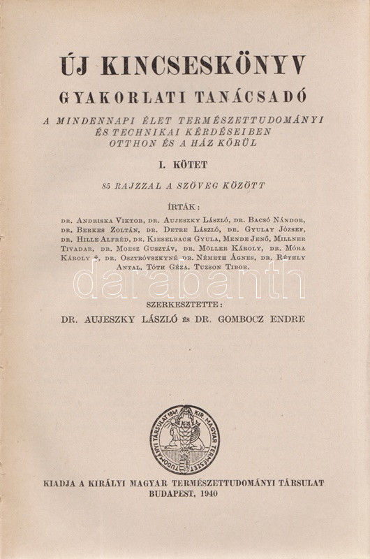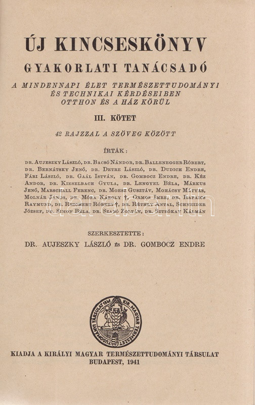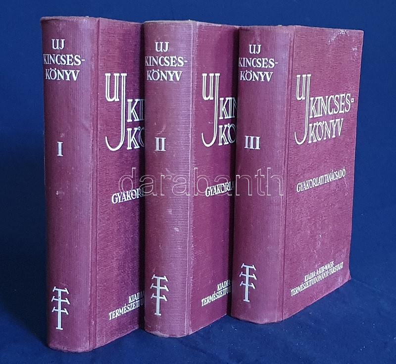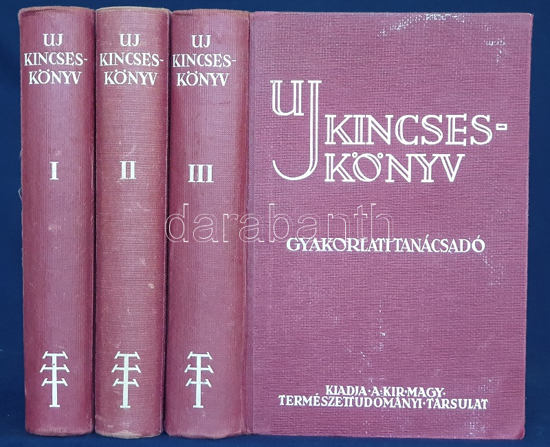 Új kincseskönyv. Gyakorlati tanácsadó. A mindennapi élet természettudományi és technikai kérdéseiben otthon és a ház körül. Szerkesztette: Aujerszky László és Gombocz Endre. I-III. kötet. [Teljes.] Budapest, 1940-1941. Királyi Magyar Természettudományi Társulat (Királyi Magyar Egyetemi Nyomda). [6] + 559 + [1] p.; VII + [1] + 559 + [1] p.; IV + 672 p. Általános háztartástani kötetünk első kiadása 1932-ben jelent meg, Gombocz Endre botanikus és tudománytörténész szerkesztésében, egy kötetben. A munka alaposan kibővített kiadása a háztartási tudnivalók bázisán felépülő általános természettudományos ismeretterjesztő munkák számát gyarapítja, két hasábra tördelt szövegoldalain gazdag szövegközti illusztrációs anyag kíséretében. A munka éppúgy tárgyalja az időjárási alapismereteket, mint a fűtéstechnikát, vázolja a fél év alatt felépítendő családi ház építési időbeosztását, az élelmiszermérgezés-fajták egész arzenálját tárja olvasói elé, beavat a konyhaművészet és a tartósítás eljárásaiba, konzervipari részletekkel szolgál, az élvezeti cikkek között újdonságként ismerteti a rágógumit, a koffeinmentes kávét; a világháborús időkre tekintettel bőségesen ismerteti a légvédelem és óvóhely-építés, az elsötétítés elveit, a gázálarc-viselési módszereket, beavat a folt-eltávolítás, a bőrcserzés, az impregnálás, a láthatatlan tinták készítésének eljárásaiba, taglalja a kártevőirtás, az állattartás és méhészet tudnivalóit, bevezet a fényképezés és a rádiózás részleteibe, valamint alapos kertészeti, szőlészeti, borászati ismeretekkel szolgál, végül táblázatos formában közli a csillagászat, a meteorológia, a geográfia, a földtan, az ásványtan, a botanika és a zoológia meghatározott tudásanyagát. A második kötet első előzékén régi tulajdonosi bejegyzés. BOEH VII: 3362. BOEH VIII: 2524. Horváth 0. Egységes, feliratozott kiadói félvászon kötésben. Jó példány.