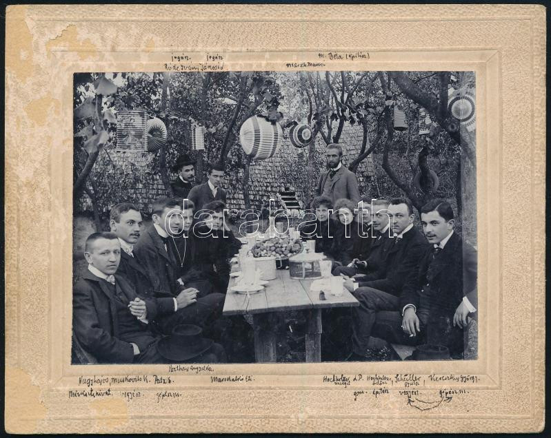 1907 Pomáz, Marschalkó Béla (1884-1962) épÃtész barátai és egykori fÅ‘reáliskolai társai (Ródé János, Schüller Gyula, Kereszthy György, Muskovits Károly, Patz Sándor, Hochholtzer Ödön ) körében, fotó kartonon, feliratozva: dátummal és helyszÃnnel a hátoldalán, valamint az elején nevesÃtésekkel, 8x11 cm