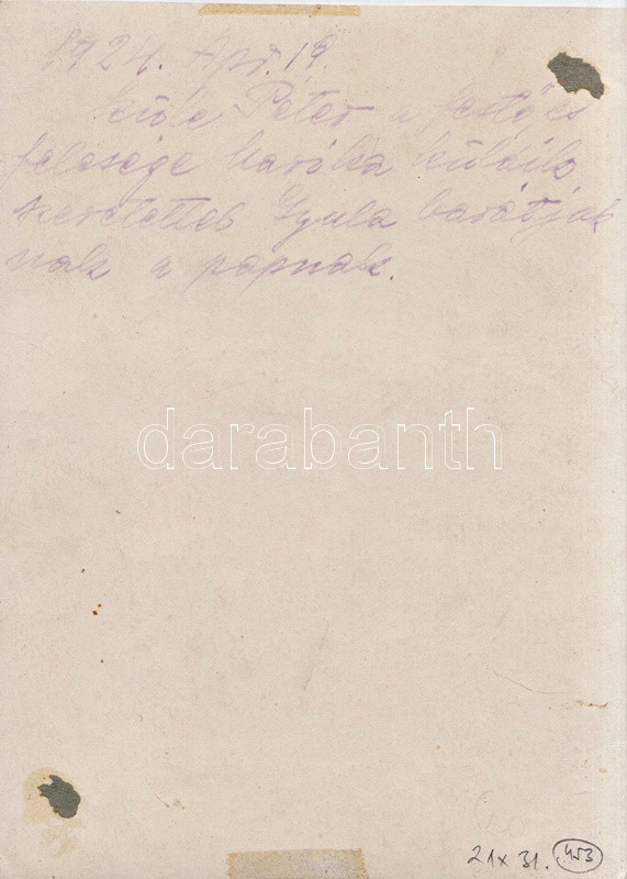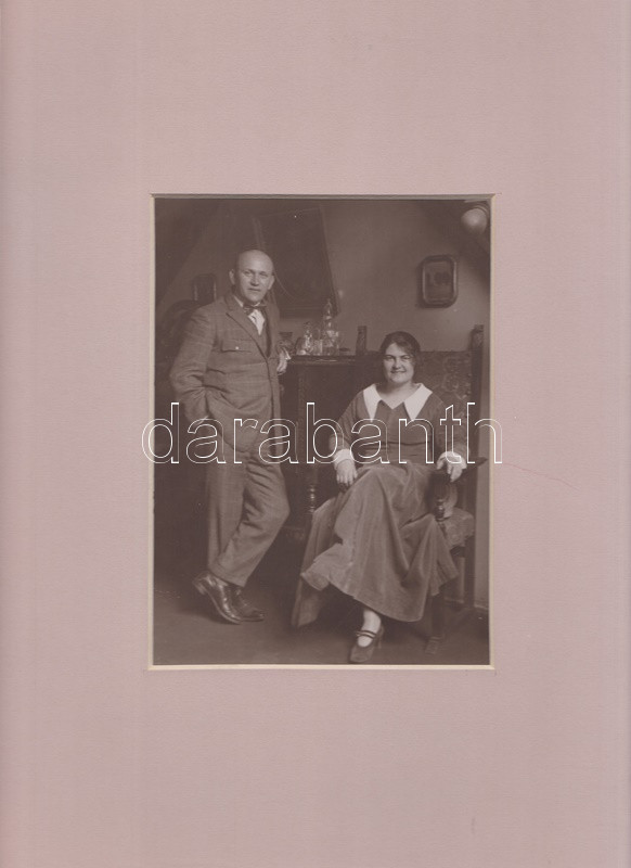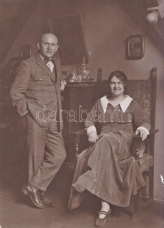 Szüle Péter (1886-1944) festÅ‘művész egész alakos portréja felesége társaságában, lakásuk szalonjában. A felvétel hátoldalán a festÅ‘művész saját kezű ajándékozó sorai. A fénykép 1924.április 19-én készült, készÃtÅ‘je ismeretlen. Vintázs, zselatinos ezüst nagyÃtás, mérete: 167x120 mm. A kép hátoldalán a festÅ‘ saját kezű ajándékozó sorai: ,,1924. ápr. 19. Szüle Péter, a festÅ‘, és felesége, Katóka küldik szeretettel Gyula barátjuknak, a papnak." Szüle Péter a budapesti KépzÅ‘művészeti FÅ‘iskolán tanult, Zempléni Tivadar, Ferenczy Károly és Balló Ede voltak a mesterei. Utána hosszabb tanulmányutat tett Németországban, Franciaországban és Olaszországban, valamint Hollandiában, ahol Rembrandt hatása alá került. Tanulmányútja után Budapesten dolgozott, 1928-ig a szolnoki művésztelep tagja is volt. Tárlatait az Ernst Múzeum, illetve a Műcsarnok rendezte. Jó állapotú lap, paszpartuban.