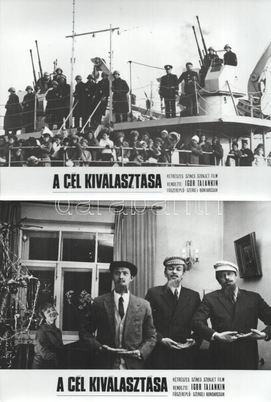 Description: cca 1989 előtti ,,A cél kiválasztása" című szovjet film jelenetei és szereplői, 19 db vintage produkciós filmfotó (vitrinfotó, lobbyfotó) ezüst zselatinos fotópapíron, a használatból eredő (esetleges) kisebb hibákkal, 18x24 cm
