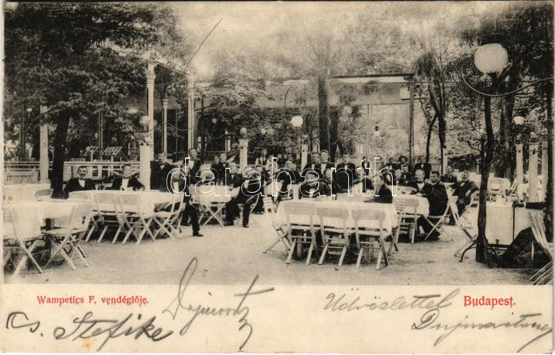 1906 Budapest XIV. Városliget, Wampetics F. vendéglője, kert pincérekkel. D. K. Bp. 1906. (EK)
