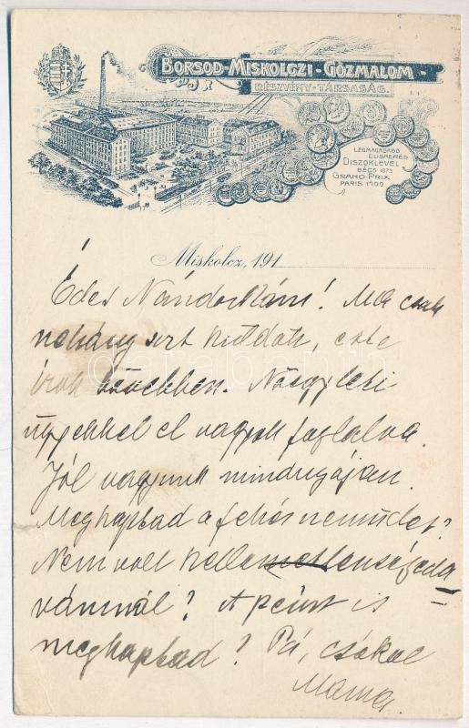 1913 Miskolc, Borsod-Miskolci-Gőzmalom Részvénytársaság, magyar címer....
