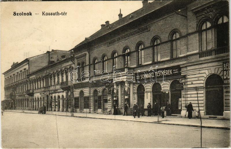 1914 Szolnok, Kossuth tér. Schwarcz testvérek üzlete, Magyar Kir. Pénz...