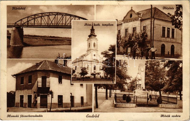 1936 Endrőd (Gyomaendrőd), Körös híd, Római katolikus templom, Katolikus népház, Hősök szobra, emlékmű, Homoki üzlete és saját kiadása (fa)