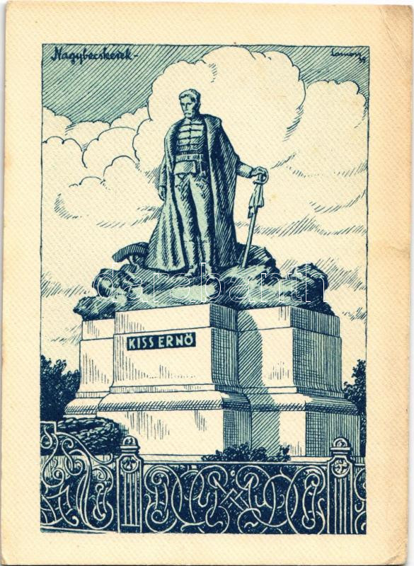 Description: Nagybecskerek, Zrenjanin, Veliki Beckerek; Kiss Ernő szobra. Kiadja a Délvidéki Egyetemi és Főiskolai Hallgatók Egyesülete / Hungarian irredenta propaganda, monument s: Lamoss (EK)