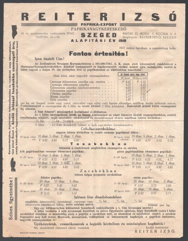 1941 Reiter Izsó Paprika-Export, Szeged - Árellenőrzési Orsz. Korm.Biztos rend.ért. kiadott Árjegyzék