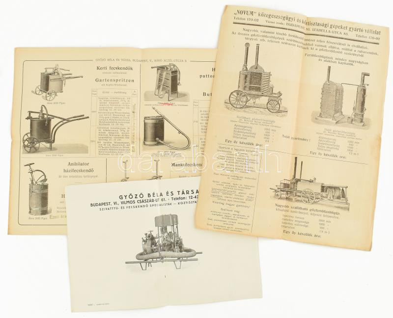 cca 1920 3 db köztisztasági gépeket ábrázoló képes reklám nyomtatvány. Győző Béla.