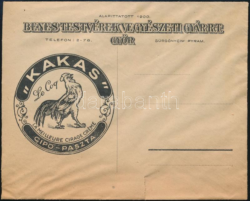 cca 1930 Benes Testvérek Vegyészeti Gyár R.T. Kakas paszta , Győr Üzleti boríték