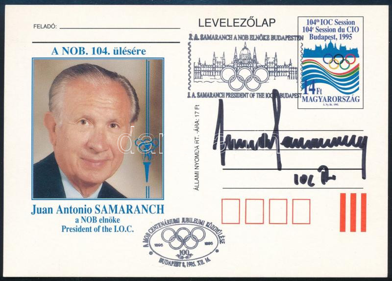 1995 Juan Antonio Samaranch (1920-2010) a Nemzetközi Olimpiai Bizottság 7. elnökének aláírása levelezőlapon