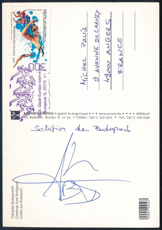Alain Bernard (1983) úszó autográf aláírása az úszó-Európa-bajnokságról küldött, budapesti képeslapon / Autograph signature of Alain Bernard swimmer