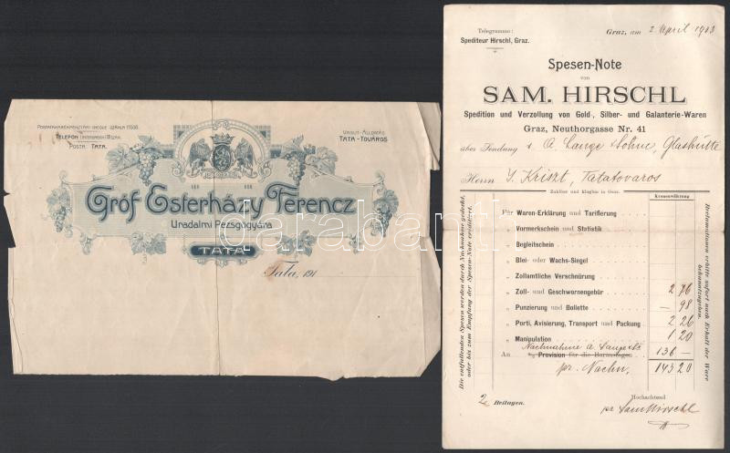 1903 Graz, Sam. Hirschl Spedition und Verzollung von Gold-, Silber- und Galanterie-Waren fejléces számla + cca 1910 Tata, Gróf Esterházy Ferencz Uradalmi Pezsgőgyára fejléces papír, sérült