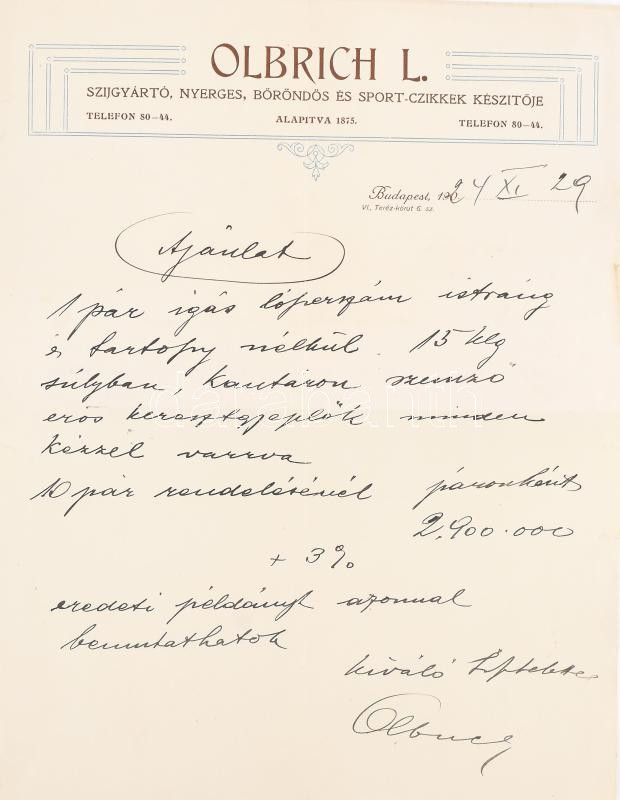 1924 Olbrich L. Szíjgyártó, Nyerges, Bőröndös és Sportcikkek Készítője...