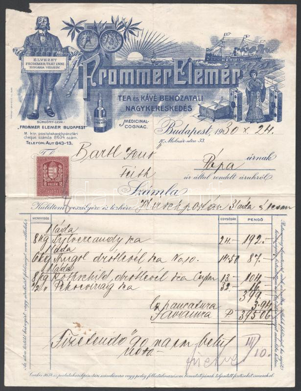 1930 Frommer Elemér Tea és Kávé Behozatali Nagykereskedés dekoratív fejléces számla Rotschild, Pekoe virág tea tárgyában, kézzel írott