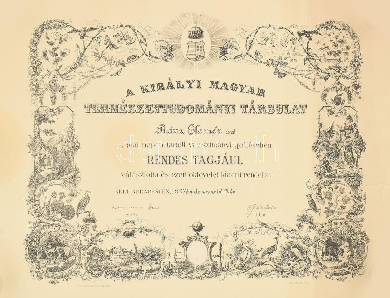 1937 Bp., a Kir. Magyar Természettudományi Társulat oklevele rendes taggá választásról Rácz Elemér részére, rajta Zimmermann Ágoston (1875-1963) Kossuth-díjas állatorvos, állatanatómus, az MTA tagja, a Természettudományi Társulat elnökének aláírásával, szárazpecséttel. Feltekerve, a lap szélén kisebb törésnyomokkal, gyűrődésekkel, 46x59 cm