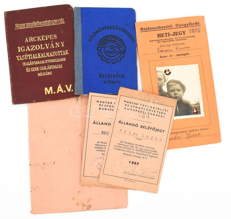 Vegyes okmány tétel, 6 db, közte a Hajdúszoboszlói Gyógyfürdő fényképes hetijegye, MÁV arcképes igazolvány, Népfölkelési igazolványi lap (sérült)