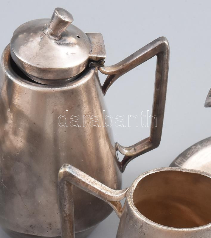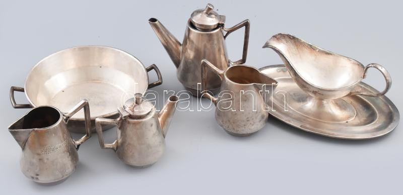 cca 1900/20, 6 darab antik alpakka kávéházi tárgy: szószos, tál, kiöntők.