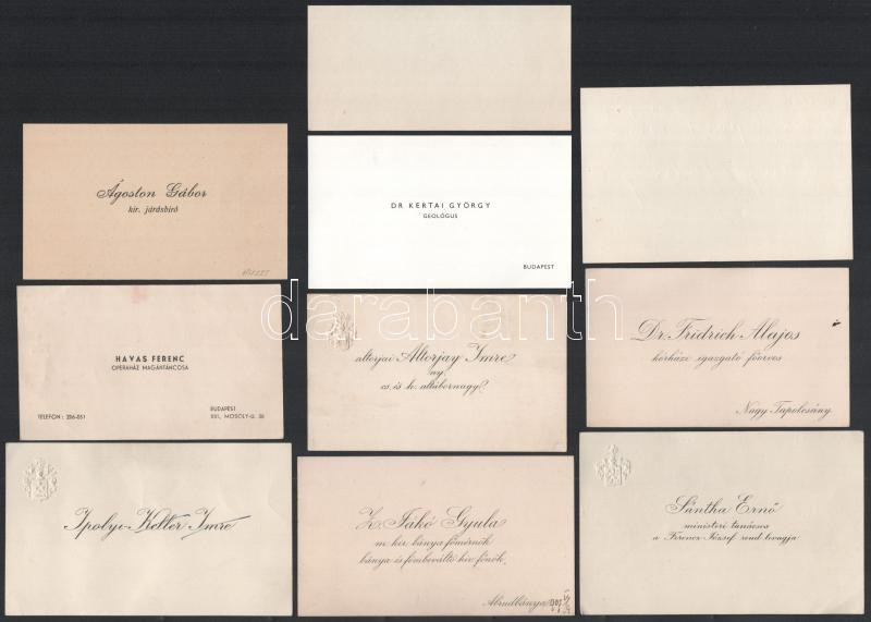 Description: 10 db névjegy- és üdvözlőkártya, mind autográf aláírásokkal és sorokkal, közte Dr. Kertai György (1912-1968) Kossuth-díjas geológus; Havas Ferenc (1935-2007) Kossuth- és Liszt Ferenc-díjas táncművész, az Operaház tagja; Sántha Ernő miniszteri tanácsos, a Ferenc József-rend lovagja; altorjai Altorjay Imre ny. cs. és kir. altábornagy; stb.