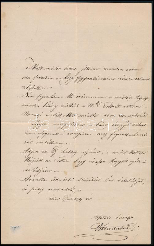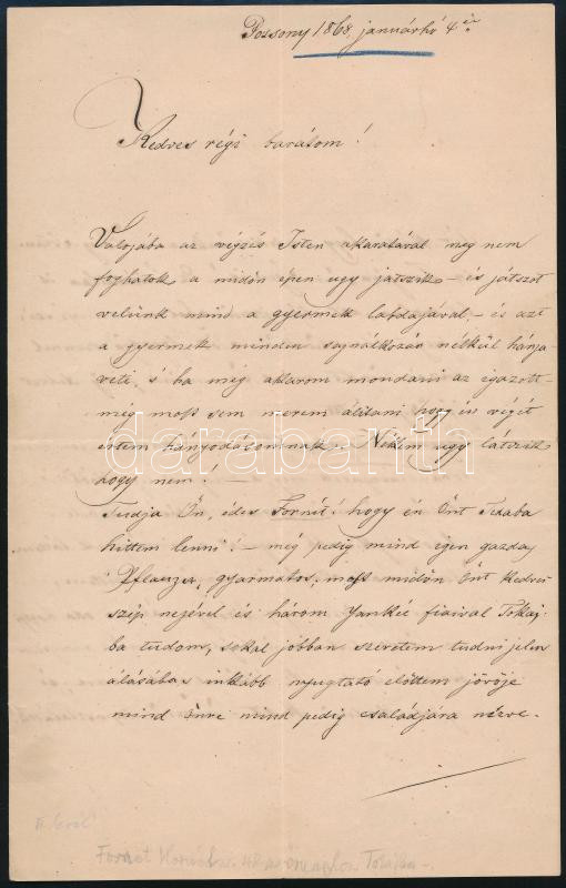 Description: 1868 Fornet Kornél (1818-1894) mérnök, 1848-as honvédőrnagy, amerikai polgárháborús ezredes, majd sótárnoknak írt levél régi harcostársától Vencz Antaltól, aki nosztalgikus sorokkal emlékezik meg az Amerikában töltött időkről, valamint megírja, hogy arégi emlékekre egy 1848-as évjáratú tokajit vett