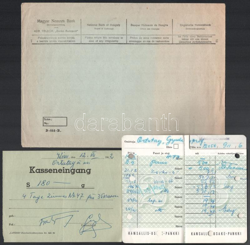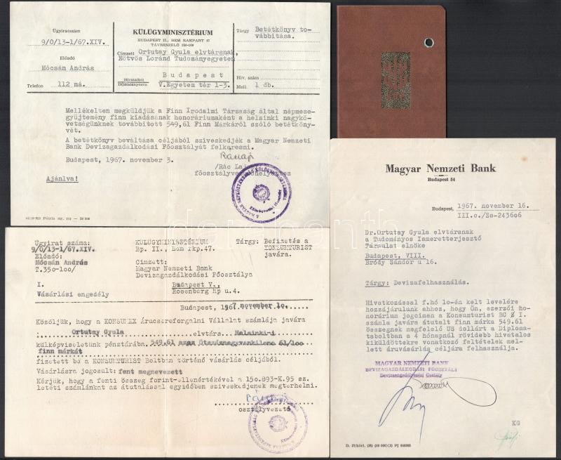 1967 Ortutay Gyula (1910-1978) néprajzkutató, politikusnak, a Finn Irodalmi Társaság honoráriumával kapcsolatos okmányok, és finn banki takarékfüzet.