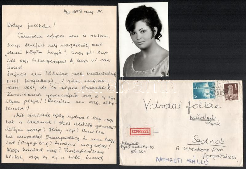 Description: 1969 Mányai Zsuzsa (1949-1999) színésznő saját kezűleg írt levele Várday Zoltán (1947-2023) színész részére, 4 beírt oldal, borítékkal + Mányai Zsuzsa fotója, 9x6 cm