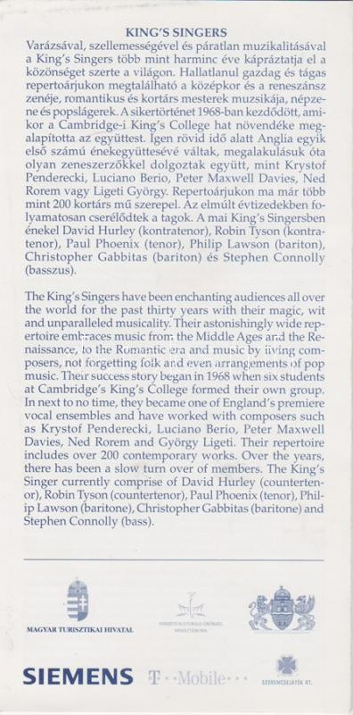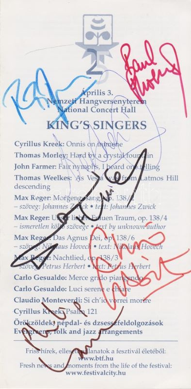 A The King's Singers brit a cappella együttes aláírása a 25. Budapesti Tavaszi Fesztivál keretében megtartott koncertfellépésük műsorfüzete első oldalán (2005). Az oxfordi King's College kórustagjainak baráti társasága az 1960-as évek közepén alapította kizárólag énekhangon alapuló zenei társulatát, melyet egykori iskolájuk iránt tisztelegve The King's Singersnek neveztek el. A kezdetektől hat énekesből álló énekkarban a mai napig változatlan a felállás, két kontratenor, egy tenor, két bariton és egy basszus szólam alkotja a zenekar egyedi, azonnal felismerhető, világszerte ünnepelt hangzását. Az alapítás óta eltelt több mint 50 évben természetesen cserélődtek a tagok, de a zenekar a mai napig a legünnepeltebb a cappella társulatnak számít, mely a legváltozatosabb zenekari, sőt könnyűzenei műveket hangszereli át saját hangzásvilágába. A 2005. április 3-án a Nemzeti Hangversenyteremben megtartott koncerten Monteverdi-, Carlo Gesualdo- és Thomas Morley-művek mellett népdal- és dzsesszfeldolgozások hangzottak el. Műsorfüzetünk első oldalán a tagok által írt színes aláírások balról jobbra, illetve felülről lefelé: Robin Tyson (kontratenor), Paul Phoenix (tenor), Stephen Connlly (basszus), David Hurley (kontratenor), Christopher Gabbitas (bariton), Philip Lawson (bariton). Tökéletes állapotú lap, félbehajtva.