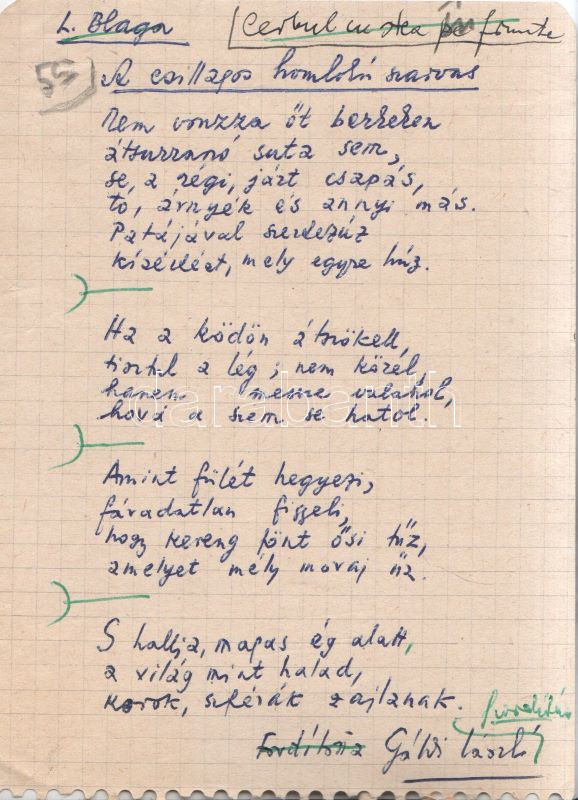 Gáldi László (1910-1974) nyelvész, irodalomtörténész, műfordító Lucian Blaga (1895-1961) román költő ,,A csillagos homlokú szarvas" című költeményéről készített műfordításának saját kézzel írott, egy oldal terjedelmű eredeti kézirata. Kelt: Budapest, 1964 körül. Egyetlen levél, mérete: 133x95 mm, 20 beírt sor. Lucian Blaga (1895-1961) a XX. század egyik legjelentősebb román gondolkodója, változatos élete során újságíró, költő, drámaíró, diplomata, egyetemi tanár és kultúraszervező, 1948 után könyvtáros és műfordító volt. Élete során hét verseskötete jelent meg, de 1948 után hallgatásra ítélték, az utolsó két évtized (1943-1961) versei csak halála után jelentek meg. Az expressszionista szabadversekkel induló Lucian Blaga hamar utat talált a mély gondolati tartalmakhoz és a kötött formákhoz, egyszersmind a román-magyar-szász együttélést szorgalmazó Blaga jelentőségét hamar felismerték a transzilvánista erdélyi magyar költők: méltatása és fordítása már az 1930-as években megkezdődött - Dsida Jenő, Áprily Lajos, Szemlér Ferenc tolmácsolta sok versét. Első reprezentatív verseskötete magyarul az 1960-as évek derekán, a román-magyar kulturális kapcsolatok kedvező idejében, az Európa Könyvkiadónál jelent meg, melybe a költő életében megjelent hét verseskötet válogatott versei mellett a hallgatásra ítélt korszak (1948-1961) költeményei is bekerültek. A ,,Mágikus virradat" címen megjelenő Blaga-versválogatás Domokos Sámuel válogatásában és előszavával jelent meg (Budapest, 1966). Áprily, Jékely Zoltán és Szemlér fordításai mellett Baranyi Ferenc és a jeles romanista Gáldi László fordította a versek zömét, Gáldi László nyelvész az érett (és hallgatásra ítélt) Blaga költeményei közül fordított. Tételünk, ,,A csillagos homlokú szarvas" című költemény a gyűjtemény 265. oldalán jelent meg. Enyhén sérült lap, hajtásnyommal és szélén apró szakadásokkal.