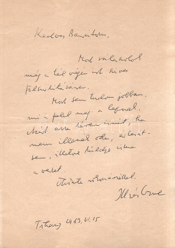 Illyés Gyula (1902-1983) költő, író, drámaíró levele Fenyő István (1929-2017) kritikushoz, a Népszabadság irodalmi szerkesztőjéhez. Kelt: Tihany, 1963. VI. 15. Egyetlen, kézzel, tintával beírt levél, mérete: 210x150 mm. Szövege: ,,Kedves Barátom, most válaszolok még a tél végén írt szíves fölszólítására. Most sem tudom jobban, mi is felel meg a lapnak. Azért arra kérem ismét, ha nem illenék oda, értesítsen, illetve küldje vissza a verset. Őszinte rokonérzéssel, Illyés Gyula.'' Jó állapotú levél, középen régi hajtás nyomával.
