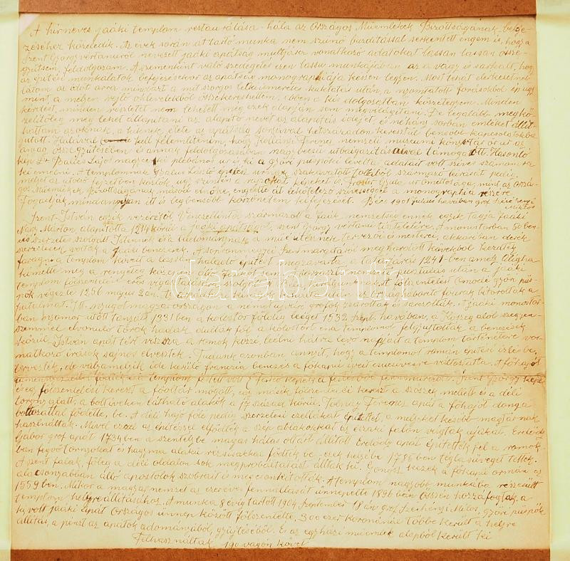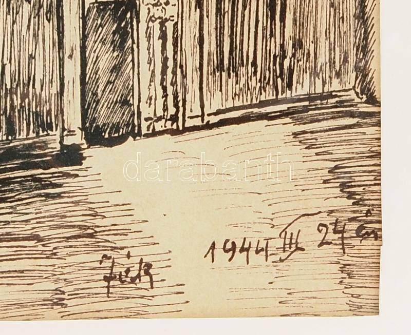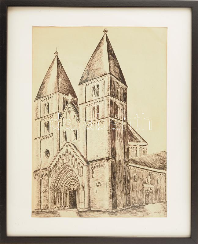 cca 1944 A Jáki templom látképe. Tus, papír, olvashatatlan jelzéssel. Hátoldalán kézirat a templom felújításáról. Üvegezett fakeretben. 41x28,5 cm