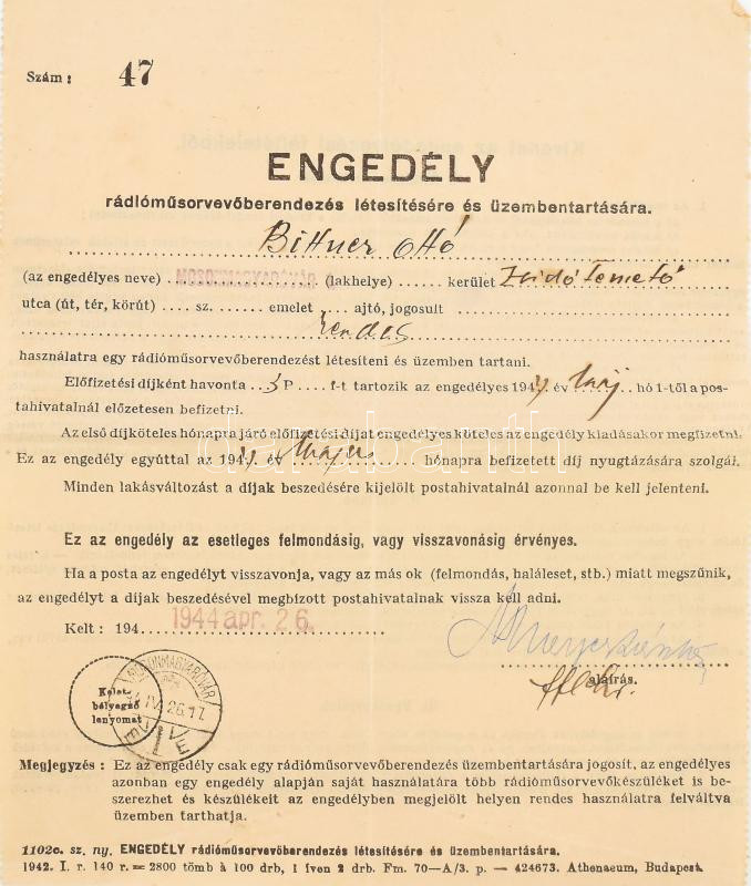 1944. április, Mosonmagyaróvár, engedély rádió üzemben tartására a zsi...