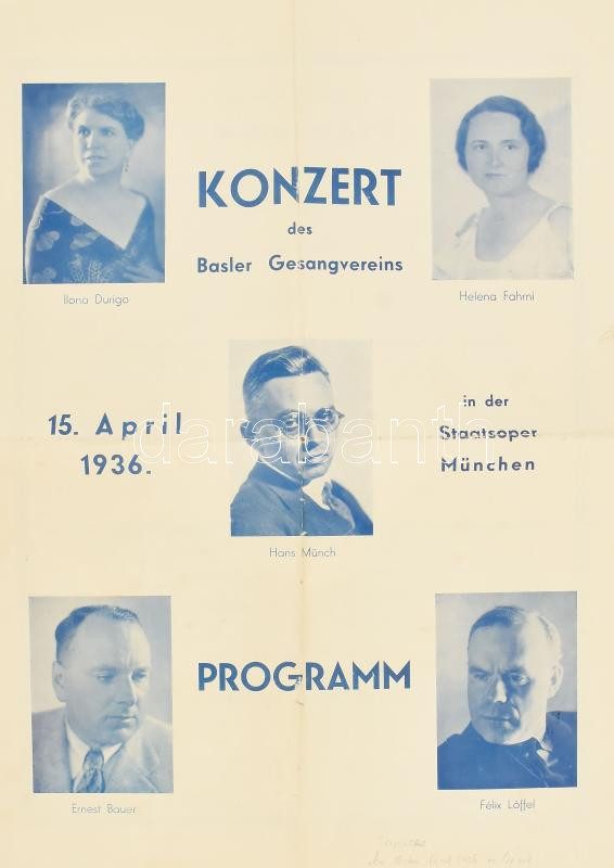 1936 Konzert des Basler Gesangvereins in der Staatsoper München, német koncertműsor-prospektus, a fellépők között Durigo Ilona világhírű magyar énekesnő. Hajtva, minimális sérülésekkel, 2 sztl. lev.